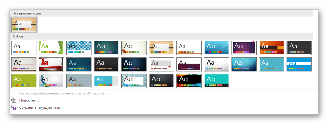 Нужно выбрать дизайн, который больше всего подходит под формат и смысл презентации. После выбора фон изменится для всех слайдов на указанный. В любой момент выбор можно изменить, информация от этого не пострадает – форматирование происходит автоматически и все внесенные данные сами подстраиваются под новый стиль.