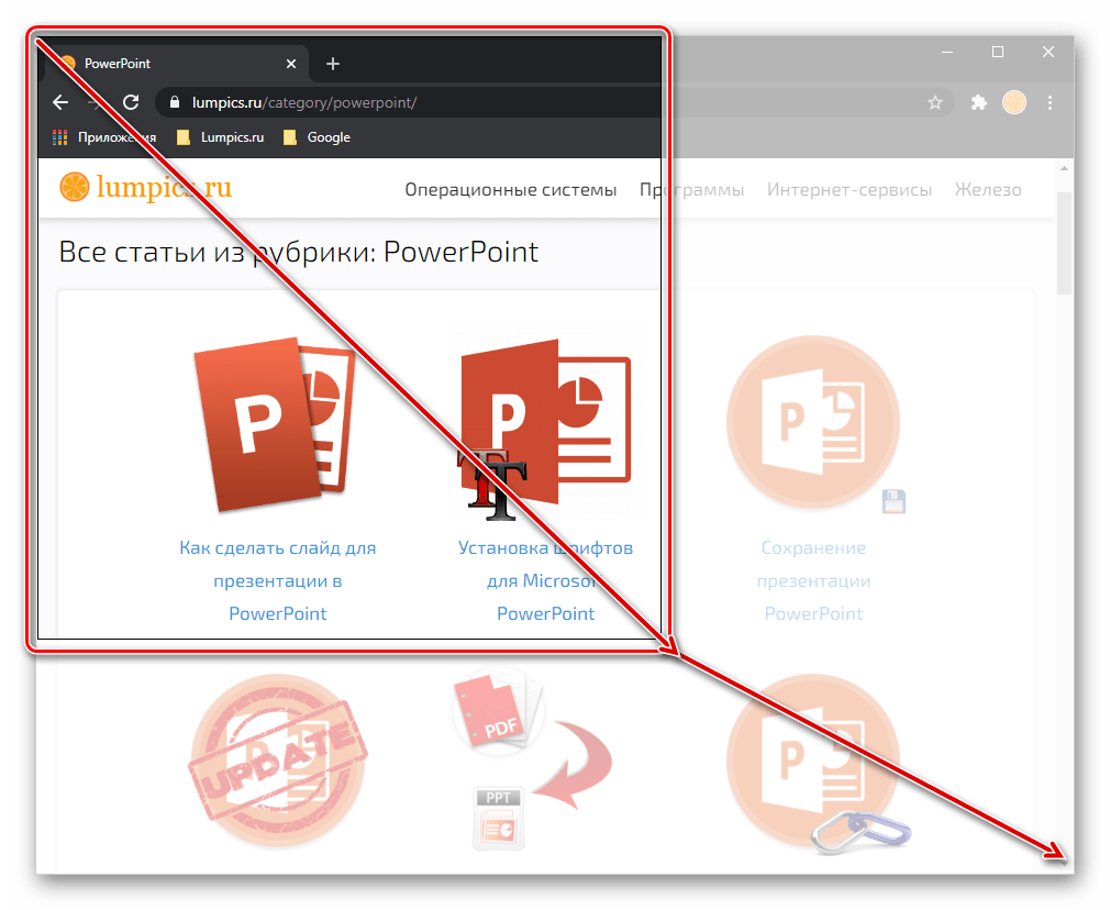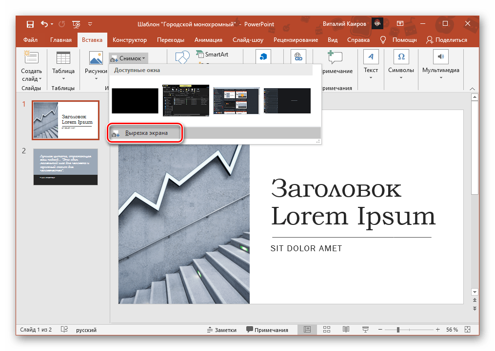 После выбора пункта «Вырезка экрана» PowerPoint автоматически будет свернут, а изображение находящегося за ним окна замутнено. Выделите необходимый фрагмент, обводя его по контуру,