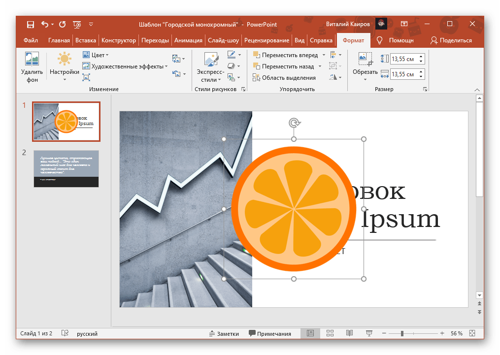 Теперь картинка не будет фоном, но будет находиться позади остальных элементов. Достаточно простой вариант, однако не без минусов. Выделять компоненты на слайде станет проблематичнее, поскольку курсор чаще всего будет попадать именно на «фон» и выбирать его.