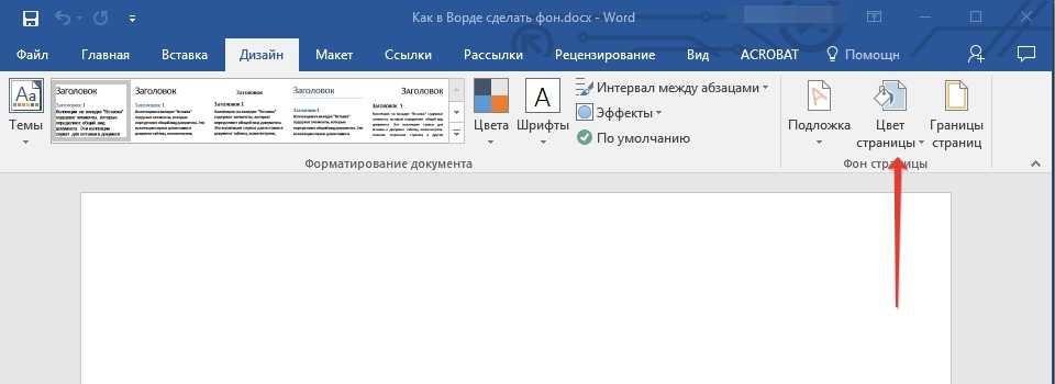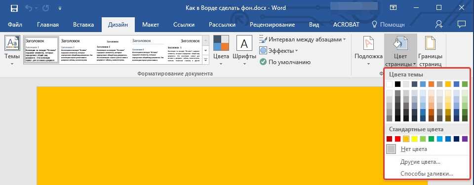Откройте вкладку «Дизайн» и выберите параметр «Цвет страницы». Он находится на панели инструментов с надписью «Фон страницы».