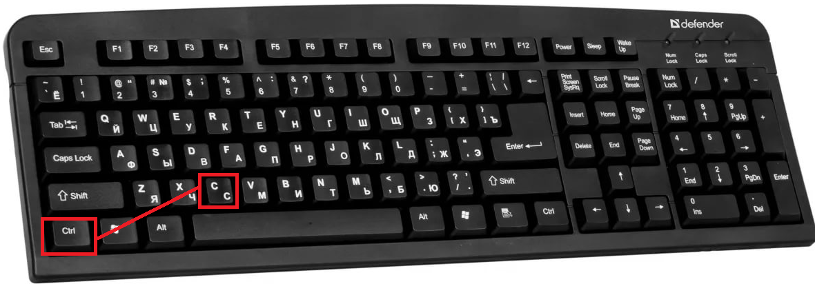 2 . Теперь нужно нажать Ctrl на клавиатуре и, не отпуская ее, нажать на клавишу C. После этого отпустить обе клавиши.