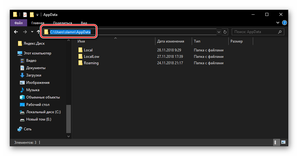 Как уже было сказано выше, каталог «AppData» по умолчанию скрыт, но если знать прямой путь к нему, это не станет помехой. Итак, вне зависимости от версии и разрядности установленной на вашем компьютере Виндовс, это будет следующий адрес: