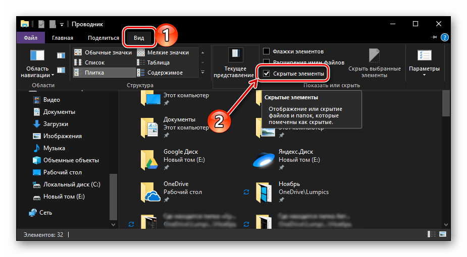 - Отметьте галочкой пункт «Показать скрытые элементы».