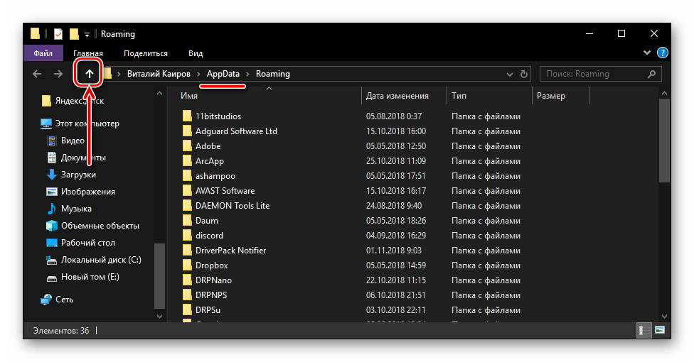 - Это действие откроет каталог «Roaming», который располагается внутри «AppData», поэтому для перехода в материнскую директорию просто нажмите «Вверх».