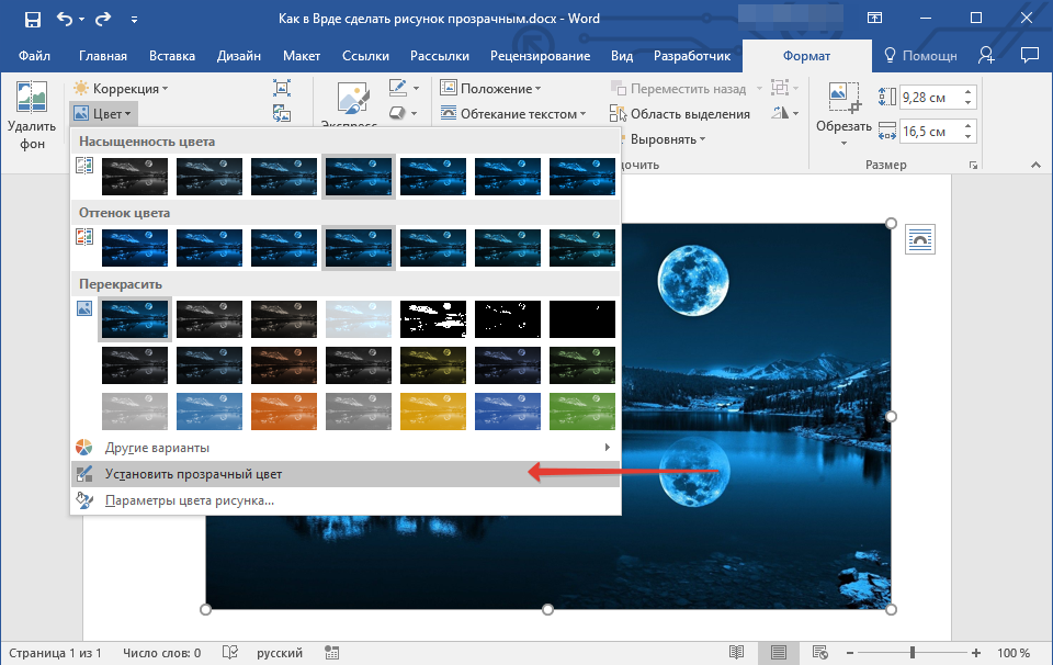 3. Нажмите на кнопку “Цвет” и выберите в выпадающем меню параметр “Установить прозрачный цвет”.