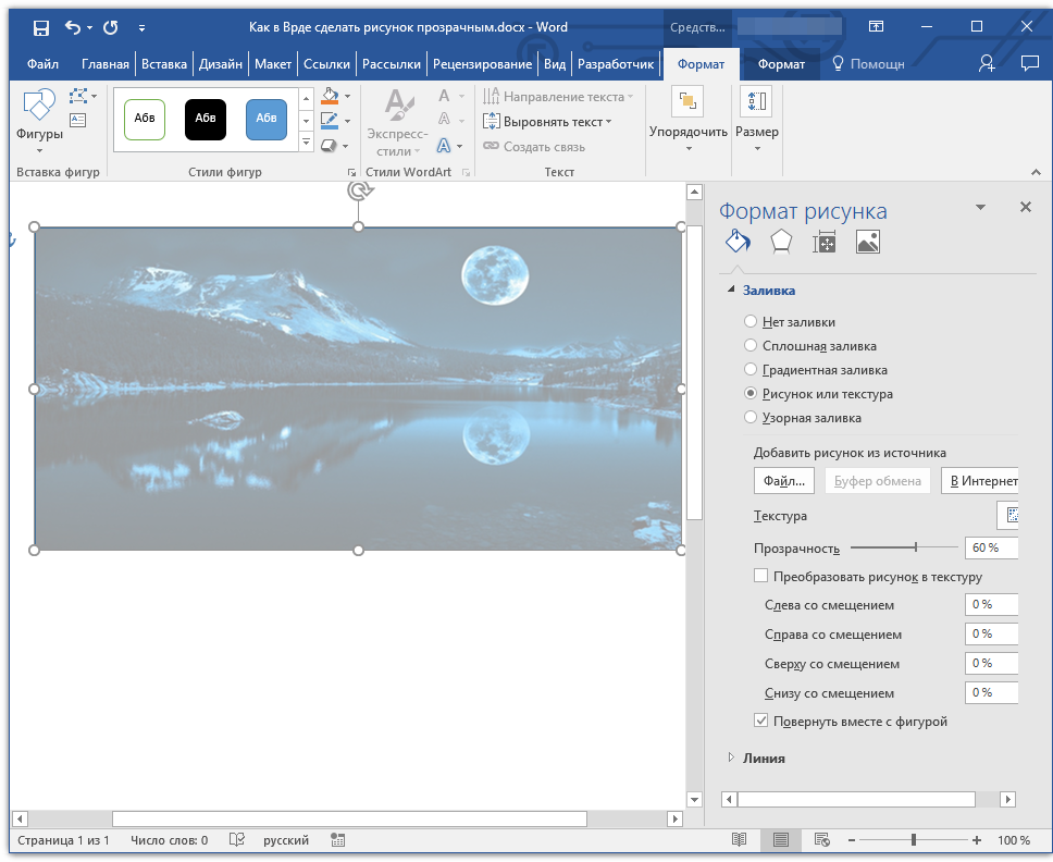 10. В окне “Формат рисунка”, которое появится справа, перемещайте ползунок параметра “Прозрачность”, пока не добьетесь желаемого результата.