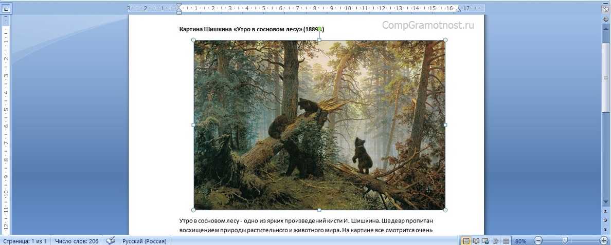После того, как мы отпустим левую кнопку мышки, рисунок станет того размера, каким мы его сделали. Остальной текст будет отодвинут от увеличившейся картинки или придвинут к уменьшившейся картинке. И так можно многократно менять размер рисунка, пока он не станет таким, каким мы его хотим видеть. Например, на рис. 10 рисунок расположен на всю ширину текста на странице.