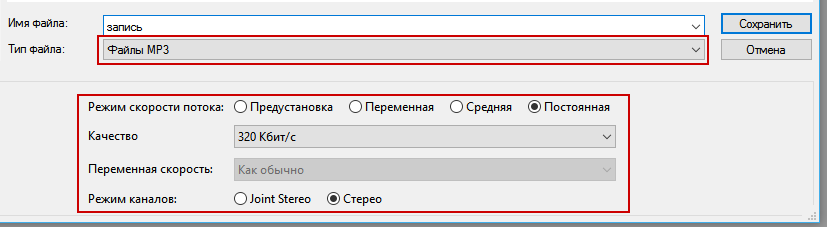 Чтобы сохранить результат вашей работы для воспроизведения в аудиоплеере или выкладывания в Интернет, нажмите «Экспорт аудио» и выберите формат MP3 с вот такими параметрами: