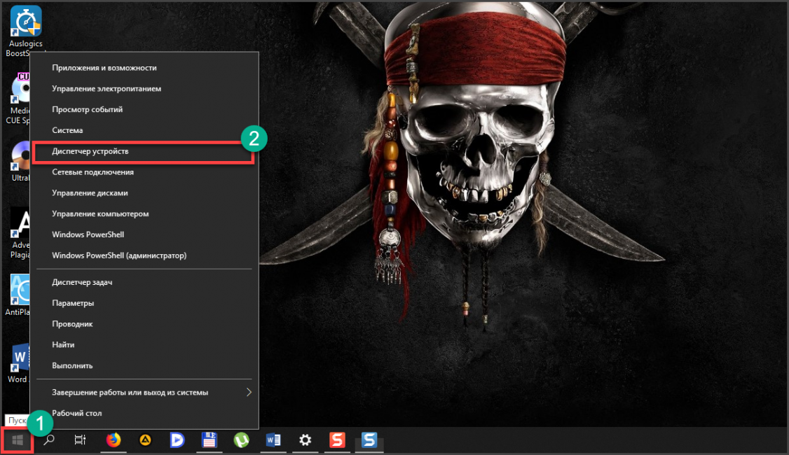 Кликаем правой кнопкой мыши по меню «Пуск» (1) и выбираем в появившемся меню «Диспетчер устройств» (2).