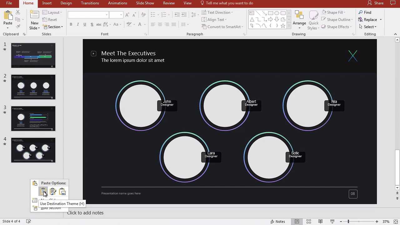 Первый вариант — Использовать конечную тему. Продолжайте и выберите это. Это обеспечит то, что слайды которые мы вставляем будут в той же теме оформления, что и презентация, в которую мы вставляем слайды. Это хорошо позаботиться о том, что объединённые слайды правильно вписываются.