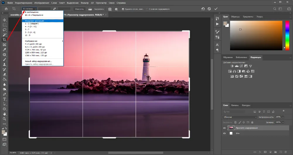 Для кадрирования в Photoshop также имеются шаблоны с заданными параметрами. Они находятся в списке, который появляется при нажатии на пункт «В соотношении».