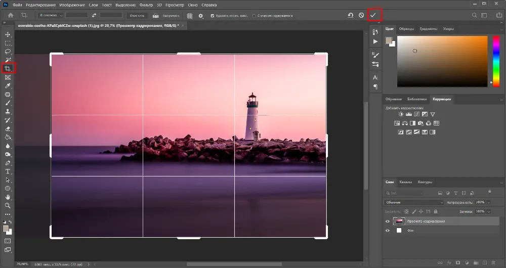 - Активируйте инструмент «Кадрирование».