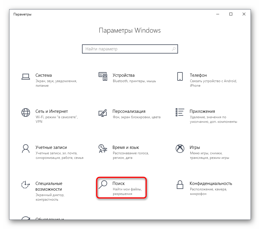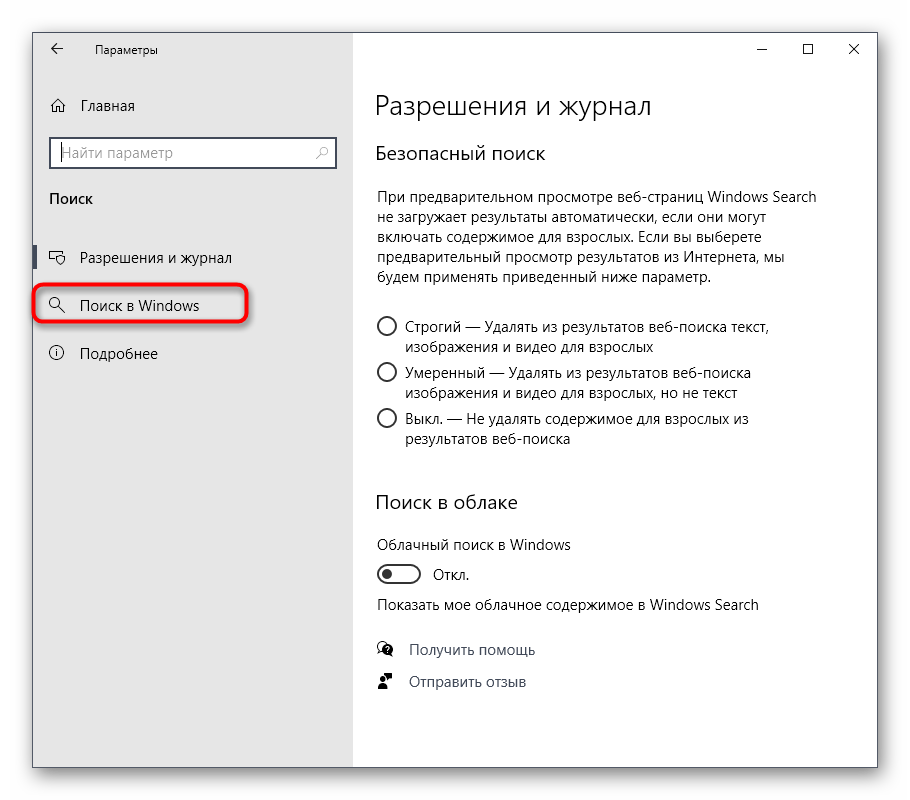 Выберите раздел «Поиск в Windows».