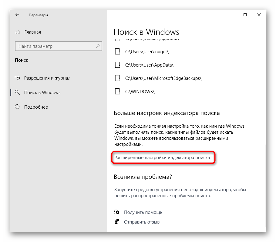 Внизу окна отыщите кликабельную надпись «Расширенные настройки индексатора поиска» и нажмите по ней ЛКМ.