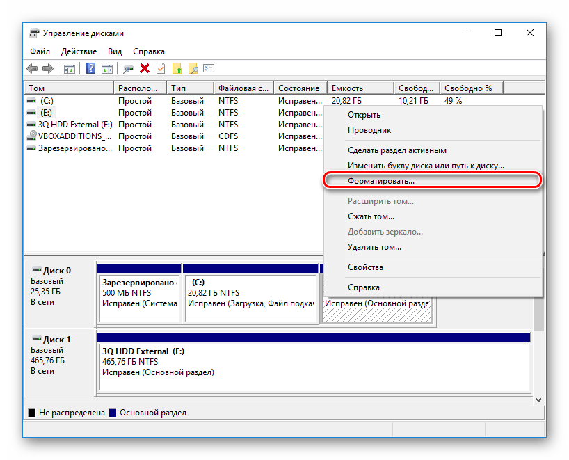 Выберите ваш HDD, и запустите функцию «Форматировать», нажав по области правой кнопкой мыши (ПКМ).