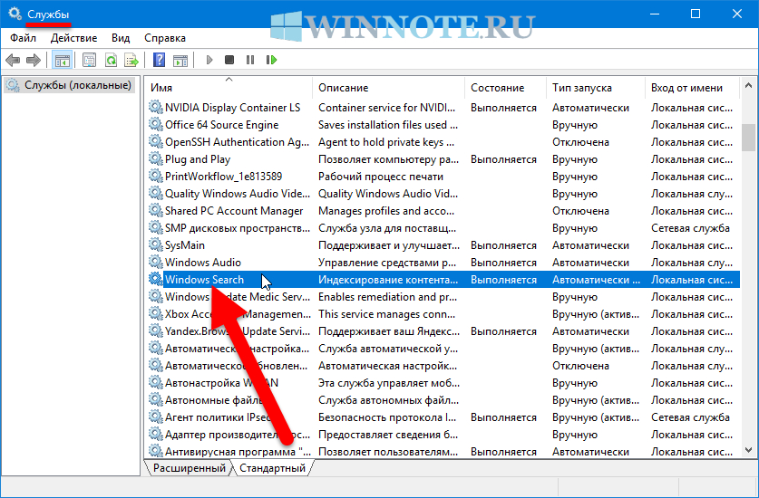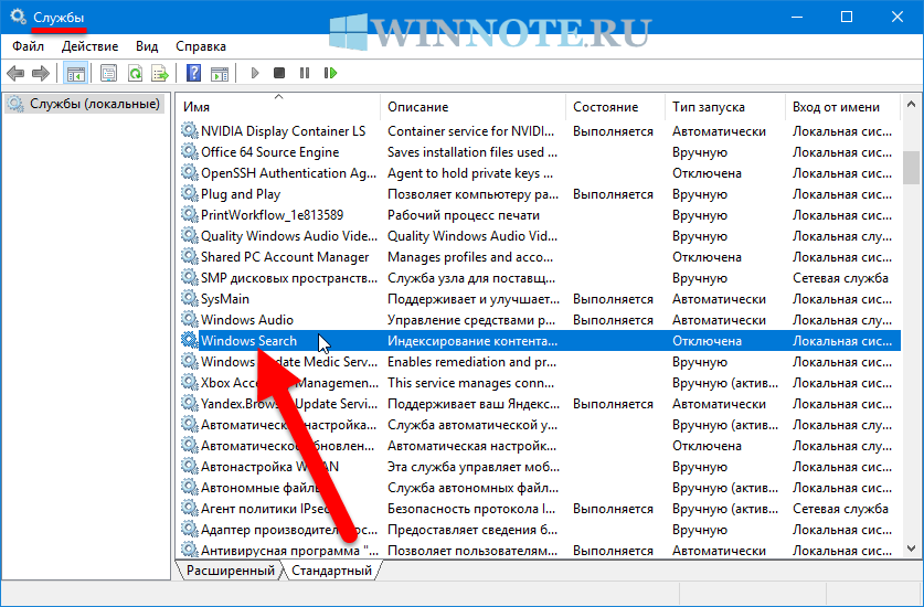 - Чтобы отключить или включить индексирование поиска (службу поиска Windows Search), необходимо войти в систему с правами администратора