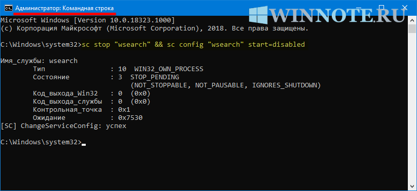 Также отключить или включить индексирование поиска (службу поиска Windows Search) можно используя командную строку.