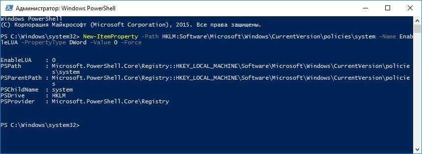 Включить обратно UAC в PowerShell можно с помощью той же команды, только в ней нужно изменить ноль на единицу.