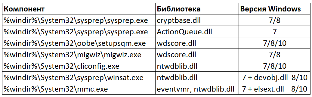 В зависимости от используемой программы из белого списка и версии Windows можно подменить ту или иную библиотеку (см. таблицу).