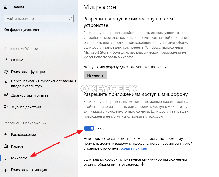 Убедитесь, что параметр Разрешить приложениям доступ к вашему микрофону включен.