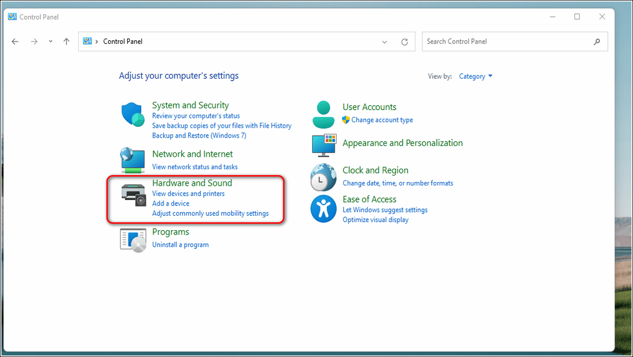 - Щелкните Оборудование и звук и откройте параметр Звук.