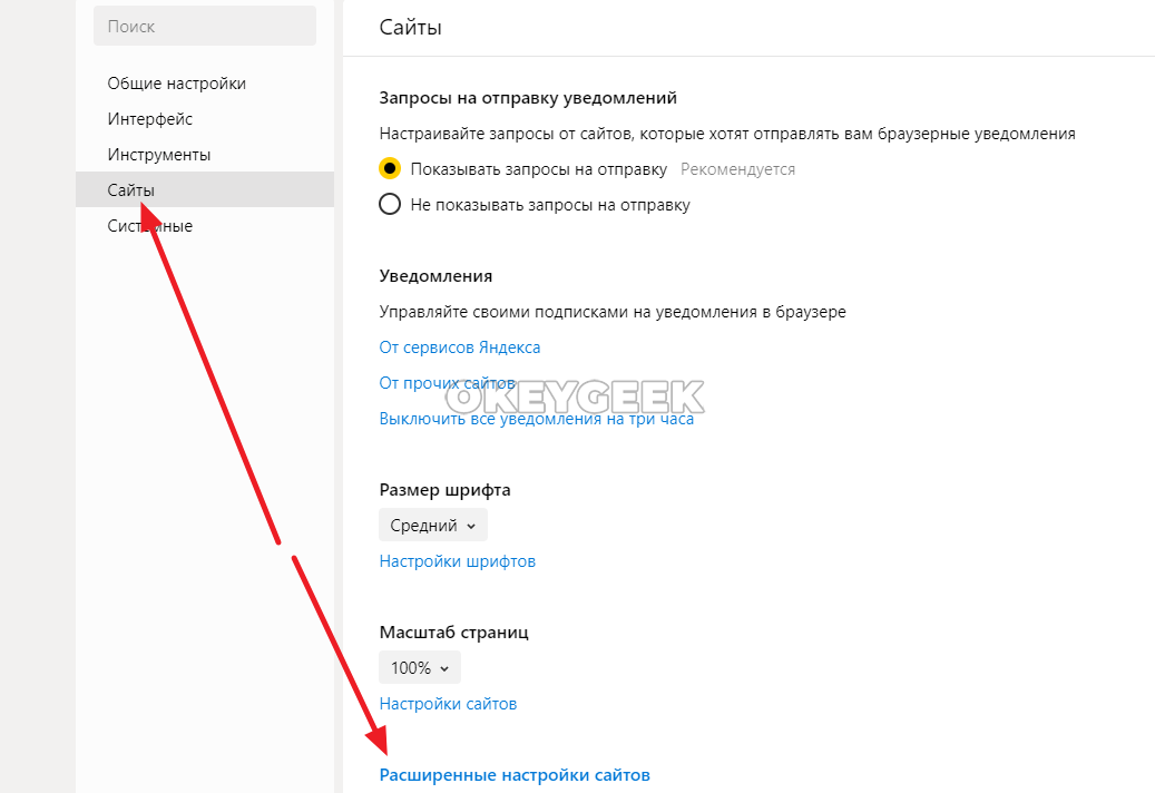 Выберите в левом меню открывшейся страницы раздел «Сайты» и перейдите в пункт «Расширенные настройки сайтов».