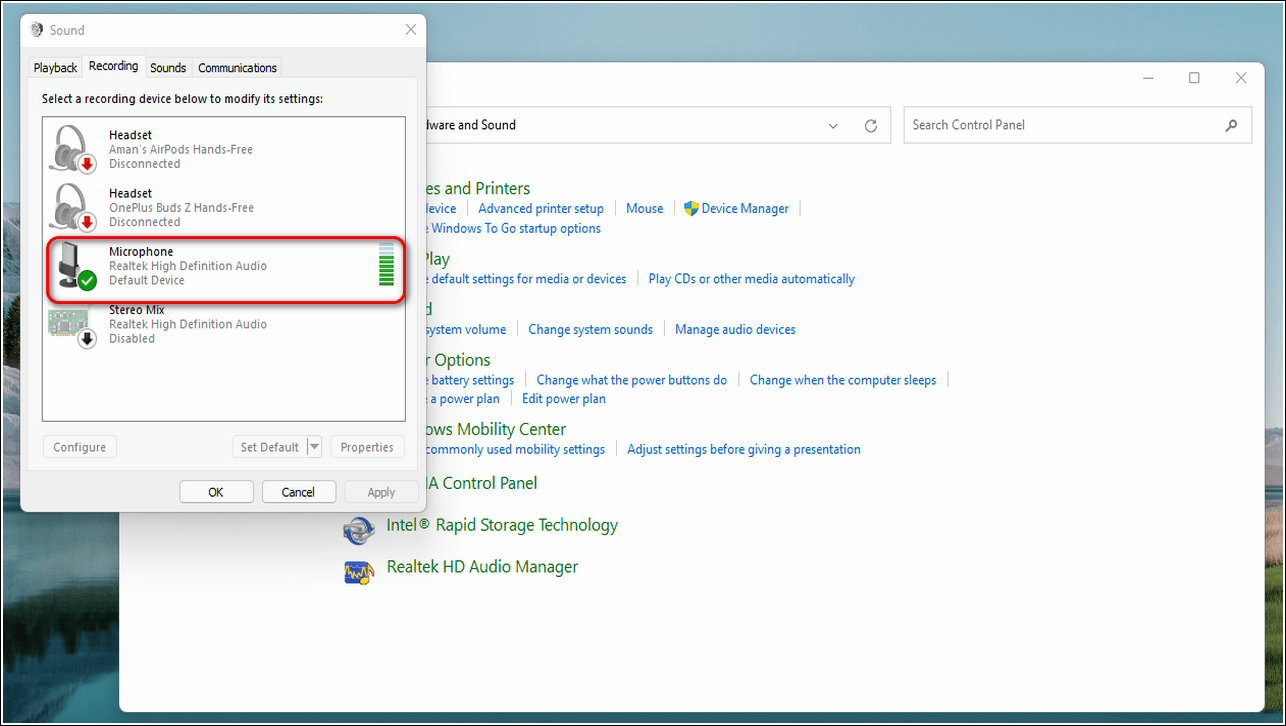 - Выберите свой микрофон и нажмите кнопку «Установить по умолчанию».