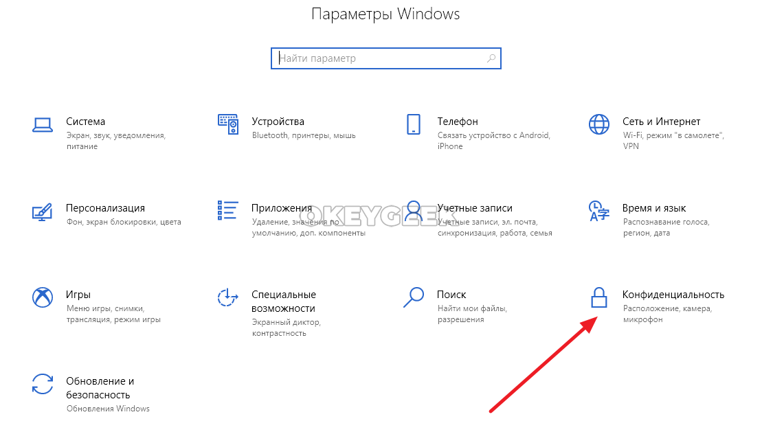 Откроются параметры Windows 10. Здесь надо перейти в раздел «Конфиденциальность».