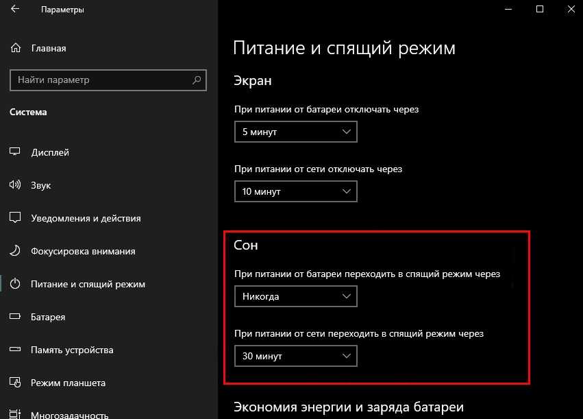 - B нем есть несколько пунктов настроек, среди которых будет «Сон». Здесь два параметра режима сна: