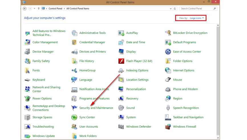 Переключаемся на «Мелкие значки» и переходим в раздел «Безопасность и обслуживание».