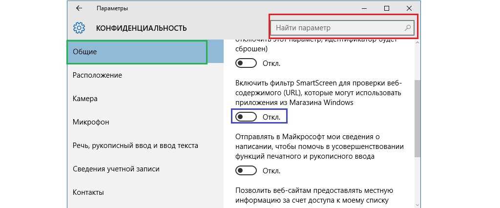 - Находим там надпись «Включить фильтр SmartScreen для проверки веб-содержимого…». Ниже находится переключатель (выделен синей рамкой). Его необходимо переставить в положение «Откл.», как это показано на том же рисунке. Для этого достаточно нажать на него.