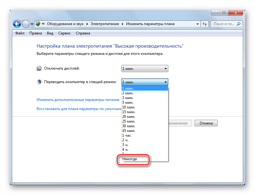 Здесь есть две важные графы: отключение дисплея и сон. Отключение дисплея можно рассматривать как альтернативу ждущему режиму на Windows 7 — с чёрным экраном компьютер будет потреблять мало энергии и, отчасти, отдыхать. Для обоих состояний можно выставить время «Никогда», чтобы ПК не отключался и не гас самостоятельно.