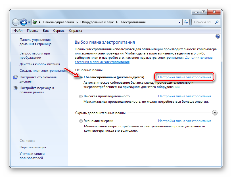 Около задействованного в настоящий момент плана находится радиокнопка в активном положении. Щелкните по надписи «Настройка плана электропитания», которая расположена справа от наименования, задействованного в данный момент плана электропитания.