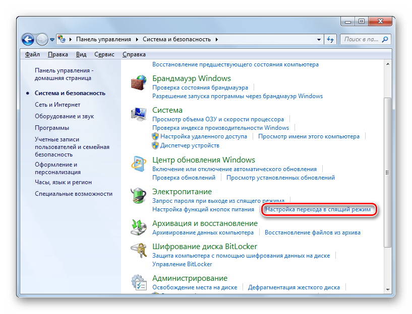 В следующем окошке в разделе «Электропитание» перейдите по «Настройка перехода в спящий режим».