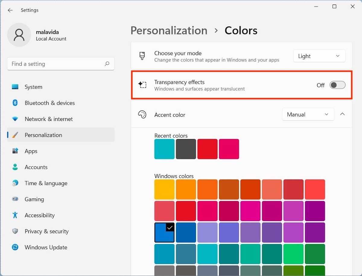 Первым действенным средством повышения производительности Windows 11 является отключение прозрачности. Этот эффект улучшает взаимодействие с пользователем и улучшает внешний вид системы. Однако это совершенно не нужно и потребляет ресурсы, которые вы можете зарезервировать для других приложений.