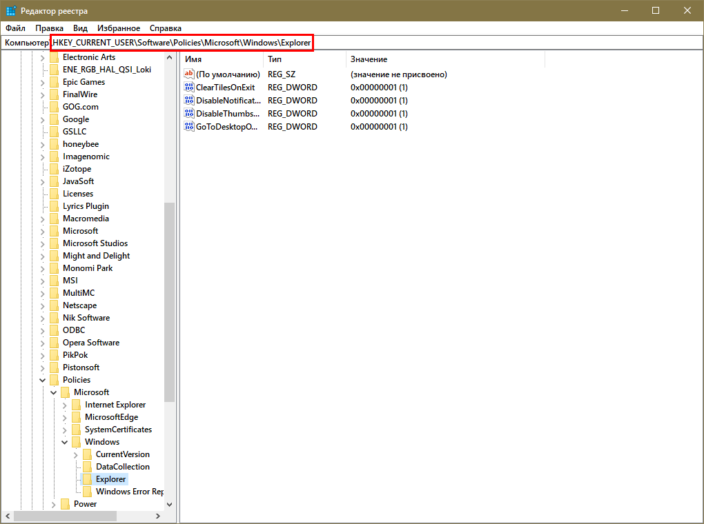 Снова необходимо открыть редактор реестра (как это сделать, было указано выше). Далее следует найти папку «Explorer», которая расположена по следующему адресу: