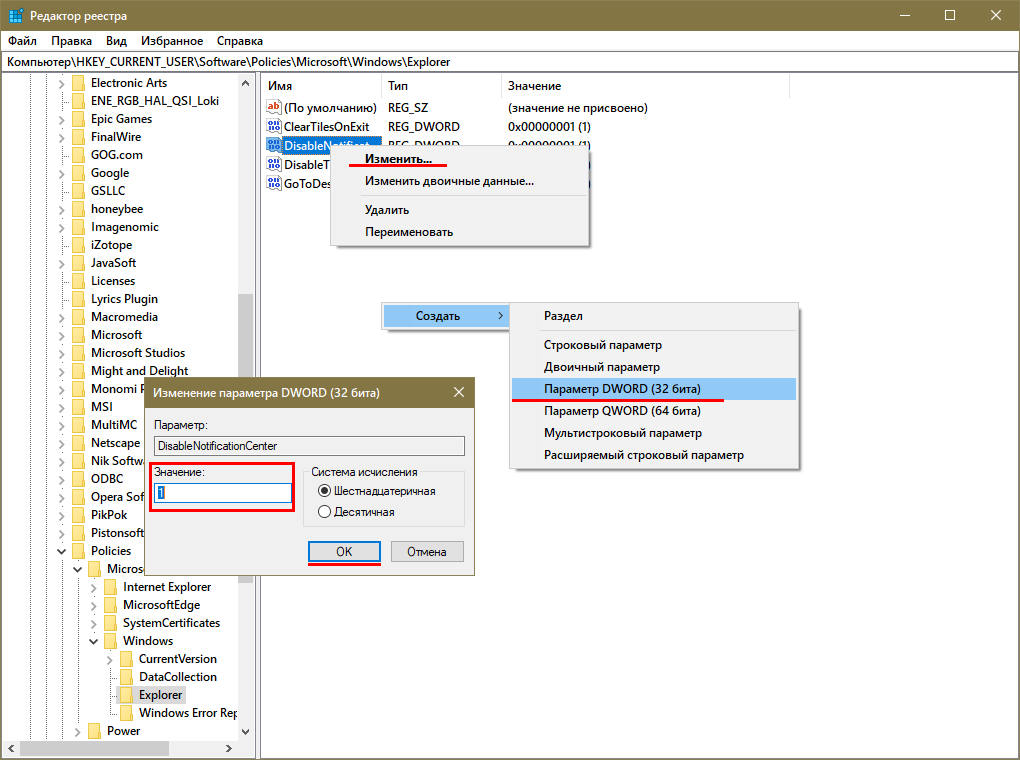 Далее необходимо сделать новый параметр DWORD (32 бита) с названием «DisableNotificationCenter». По нему следует нажать ПКМ и выбрать «Изменить…», чтобы открыть окно настроек. В новом окне присутствует поле «Значение». Там ставится 1.
