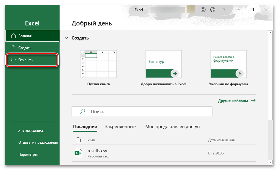 - Нажмите кнопку «Открыть», находящуюся в левом меню. Можно также задействовать комбинацию Ctrl+O, чтобы быстро перейти к меню выбора файла.