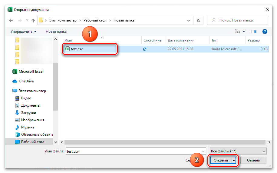 - В открывшемся окне найдите в вашем компьютере CSV файл, который хотите открыть в Excel. Выберите его и нажмите кнопку «Импорт» либо дважды кликните по файлу.