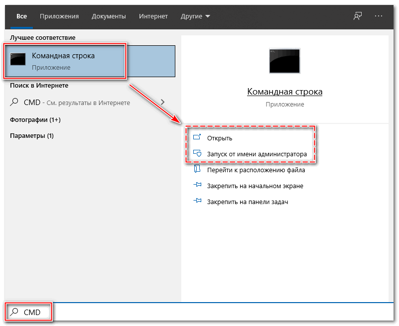 Иногда возникает необходимость открыть командную строку от имени администратора. Это нужно для исполнения команд, требующих повышенных прав доступа к системе. Чтобы это сделать в строке поиска меню «Пуск» пишем «cmd» и в результатах поиска кликаем правой кнопкой по найденной программе «cmd» и выбираем «Запуск от имени администратора»