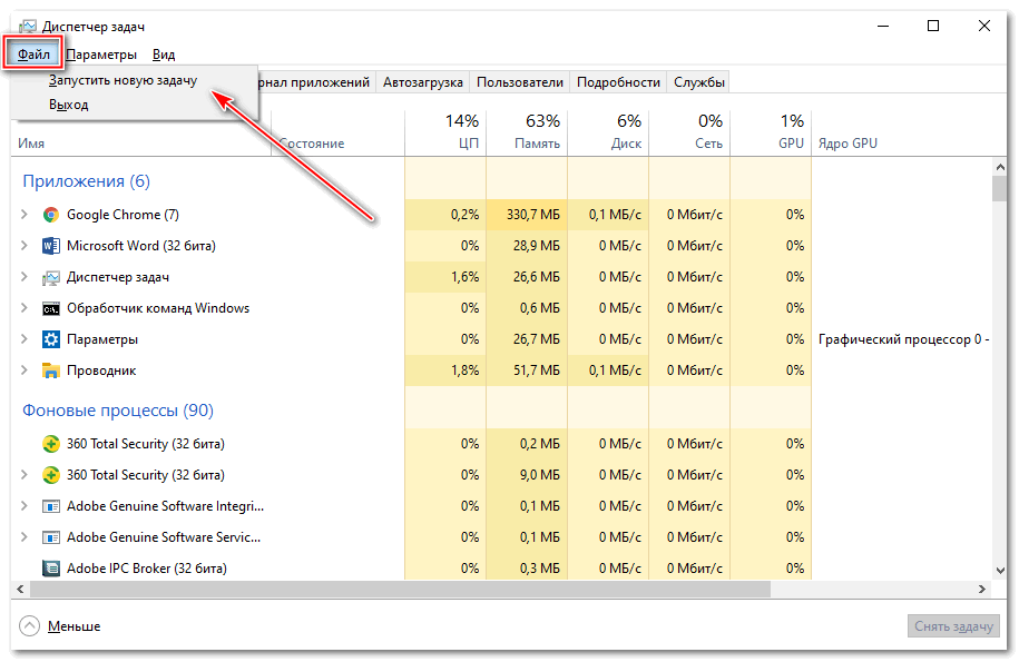 - Дальше в открывшемся окне диспетчера задач нажать копку меню Файл > Запустить новую задачу.