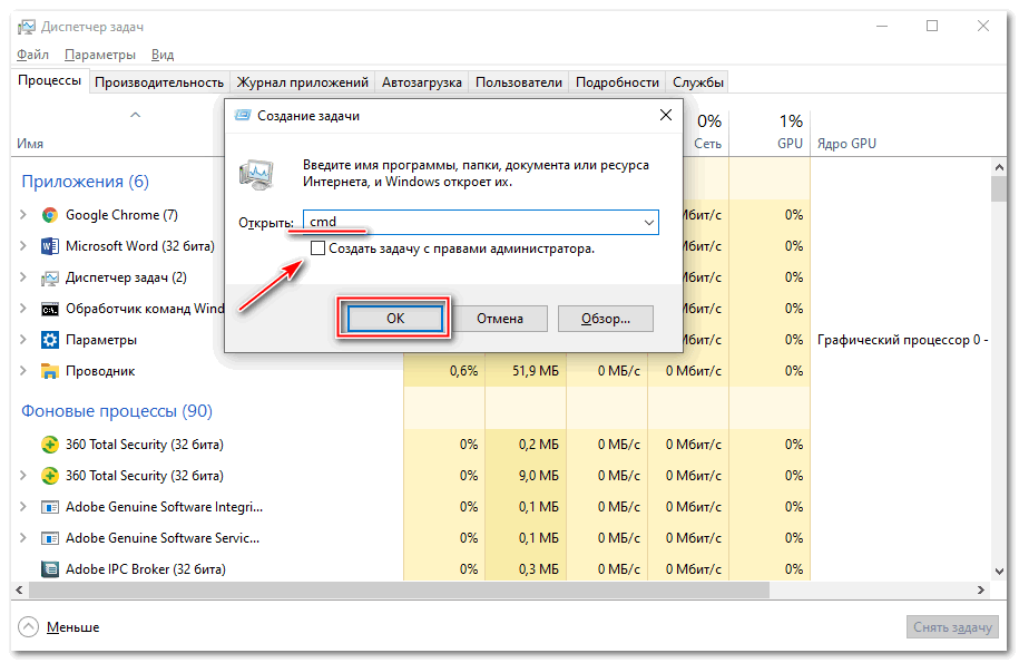 Тут почти все как и в предыдущем пункте, чтобы запустить командную строку от имени администратора — просто удерживайте клавишу CTRL зажатой на клавиатуре при щелчке Файл > Создать новую задачу, тем самым вы откроете командную строку с правами админа (никаких команд вводить не нужно)