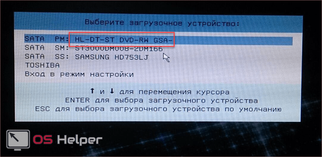 - Сразу после нажатия на эту клавишу вы увидите окно выбора устройства для загрузки. Укажите загрузку компьютера с DVD-RW.