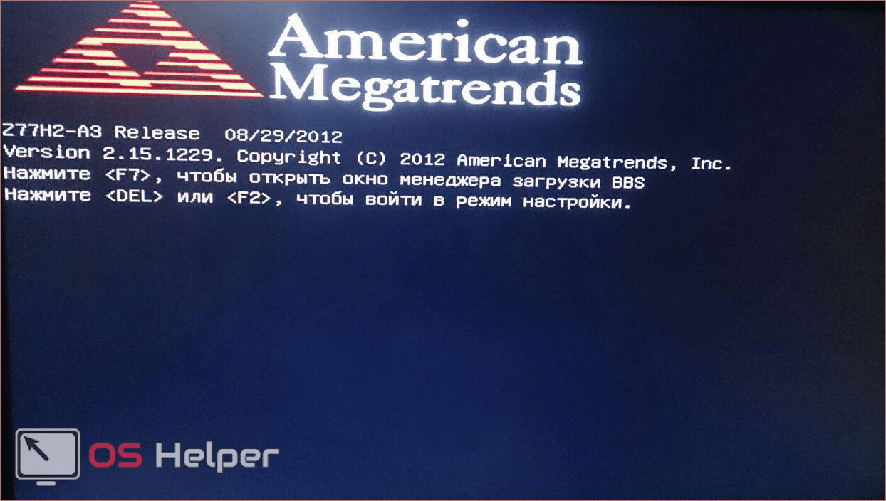 - Сначала вставьте установочный диск в DVD-привод. Перезагрузите ПК. Для того чтобы загрузиться с нужного устройства, необязательно менять что-то в Биосе. Достаточно зайти в Boot-menu. Информация о том, какую именно клавишу для этого нужно нажать, можно увидеть при загрузке ПК. В большинстве случаев используется кнопка F7