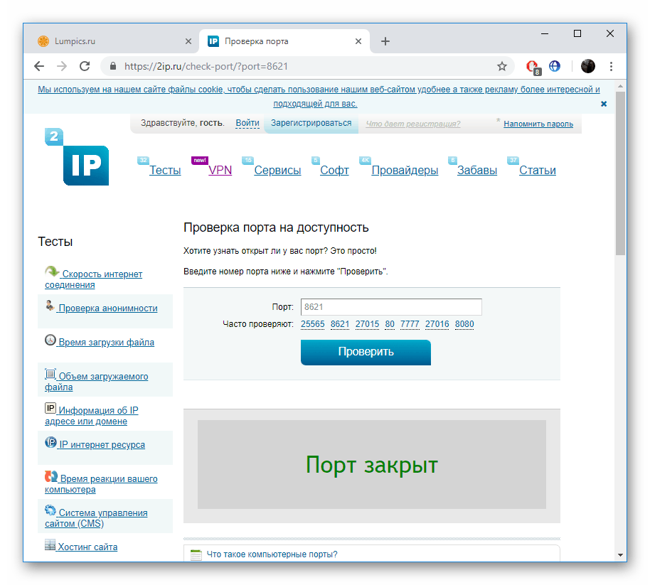 Убедиться в том, что порт был успешно открыт, можно через специальные программы или сервисы. Мы рассмотрим эту процедуру на примере 2IP: