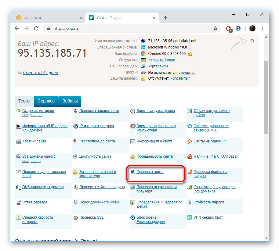 - В веб-обозревателе перейдите к сайту 2IP.ru, где выберите тест «Проверка порта».
