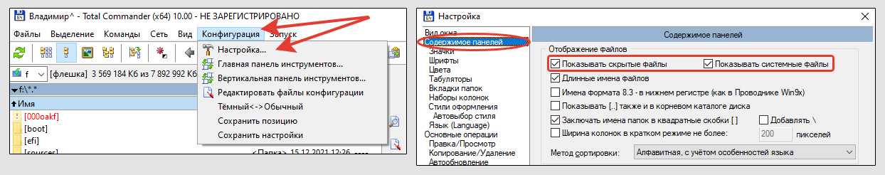 Включение скрытых элементов в Total Commander
