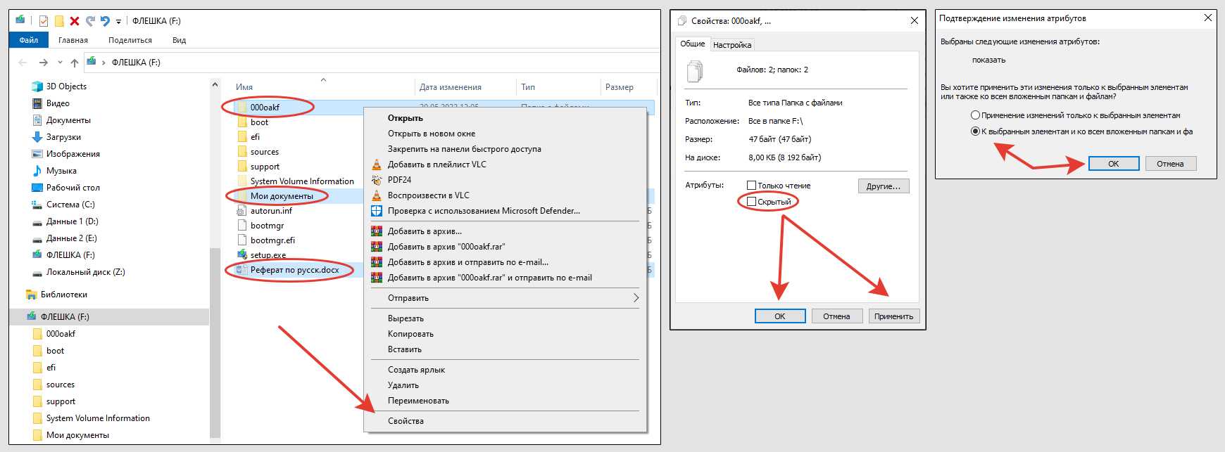 Заключительный этап — сделать все наши файлы и папки на флешке снова видимыми в системе, без обязательного включения показа скрытых элементов.