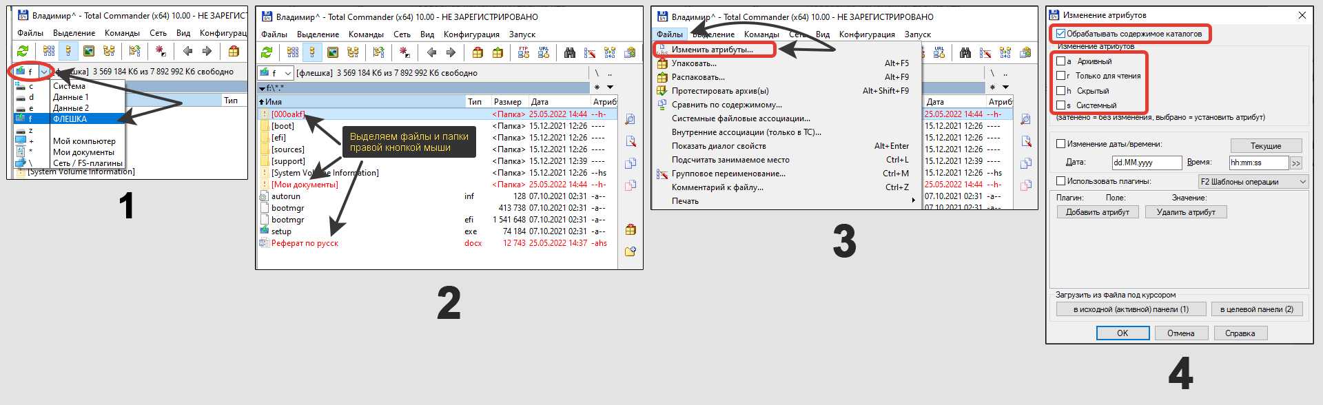Отображение скрытых объектов на флешке через Total Commander