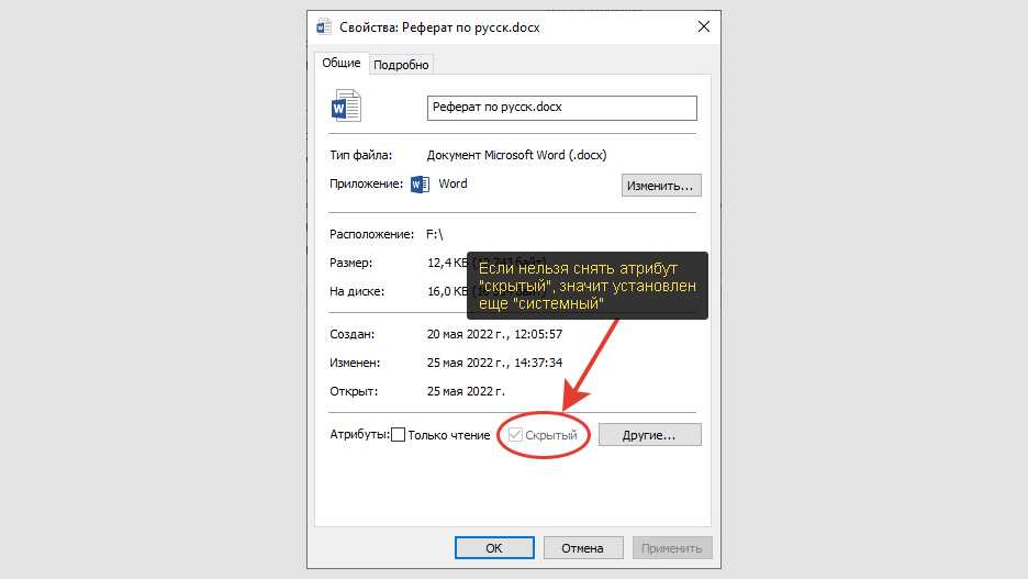 Если в свойствах файла пункт «скрытый» неактивен и не снимается, значит вдобавок установлен «системный»